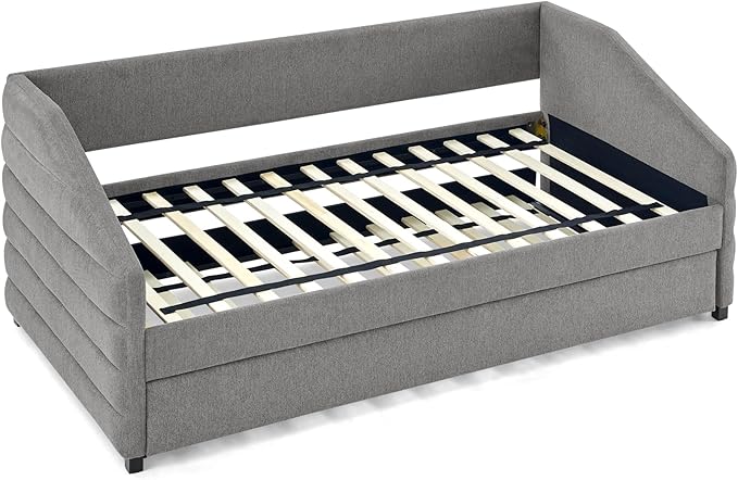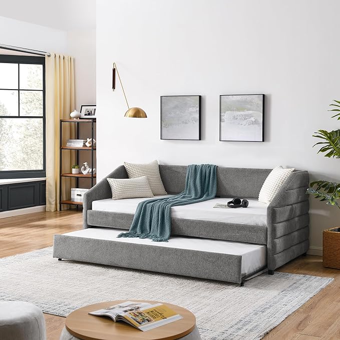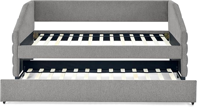 Linen Upholstered Twin Size Daybed with Twin Size Trundle, Solid Wood Tufted Sofa Bed Frame for Bedroom, Guest Room, Dorm, No Box Spring Needed, Space-Saving Design, Grey