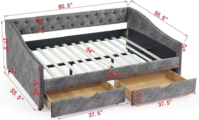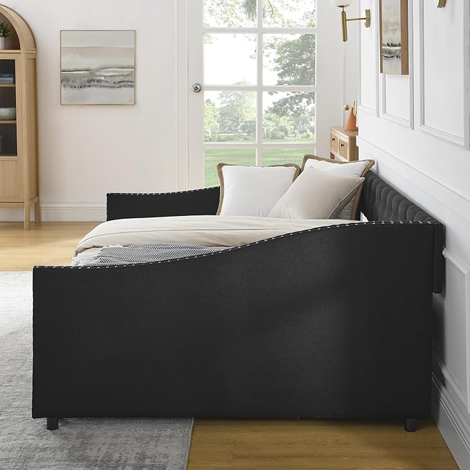 Full Size Daybed with Two Storage Drawers, Linen Upholstered Tufted Sofa Bed w/Button on Back and Copper Nail on Waved Shape Arms, for Bedroom Living Room, No Box Spring Needed, Black