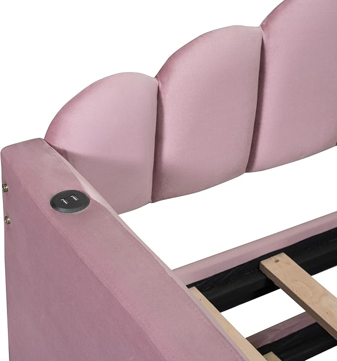 Twin Size Upholstered Daybed with Trundle and Striped Headboard, Velvet Sofa Bed w/USB Charging Ports & Side Pockets, for Bedroom Living Room, No Box-spring Needed, Pink
