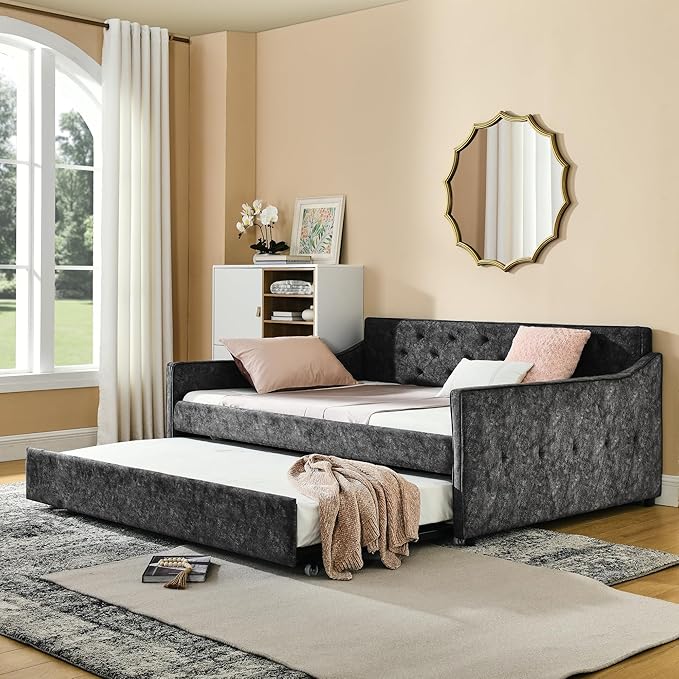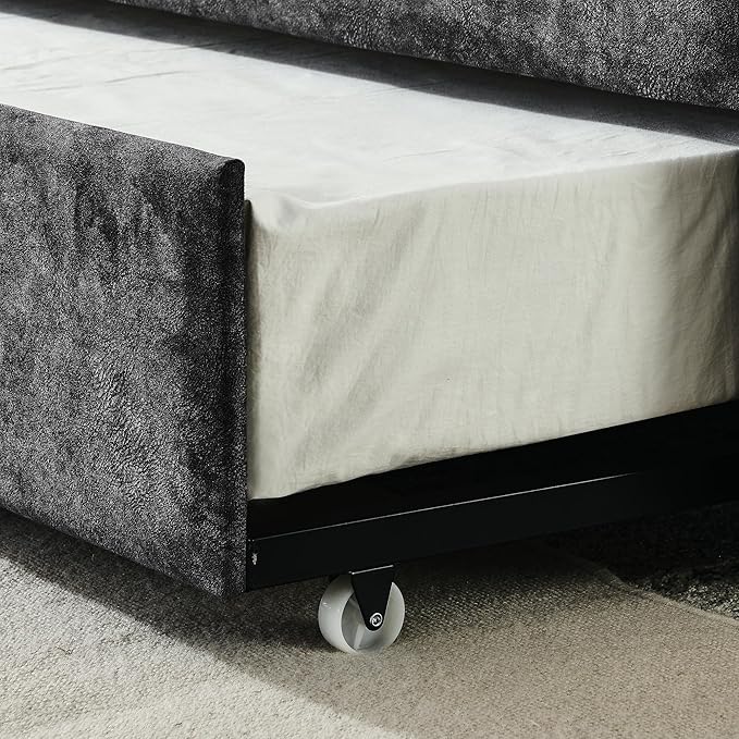 Full Size Upholstered Daybed with Twin Size Trundle, Tufted Sofa Bed w/Waved Shape Arms, for Bedroom Living Room, No Box Spring Needed & Space-Saving Design, Grey