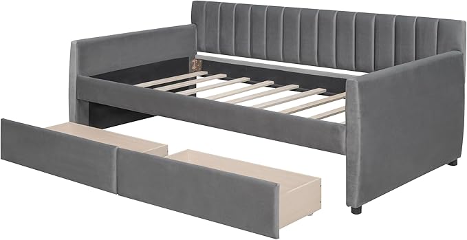 Velvet Upholstered Twin Daybed with Two Storage Drawers, Solid Wooden Bed Frame w/Vertical Stripes Designed Backrest and Pine Legs, Space-Saving Design