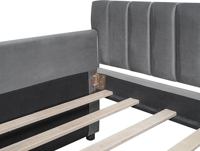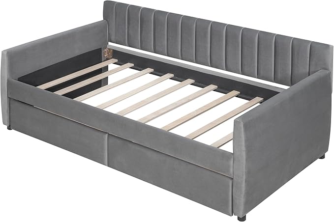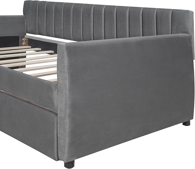 • 【Upholstered Twin Daybed】Elegant style Upholstered in carefully-selected velvet fabric, feature one backrest and two armrests, the backrest is designed with vertical stripes, elegant and generous, not only suitable for any home decoration, but also designed to last forever Not out of date. A soft fabric headboard provides comfort.