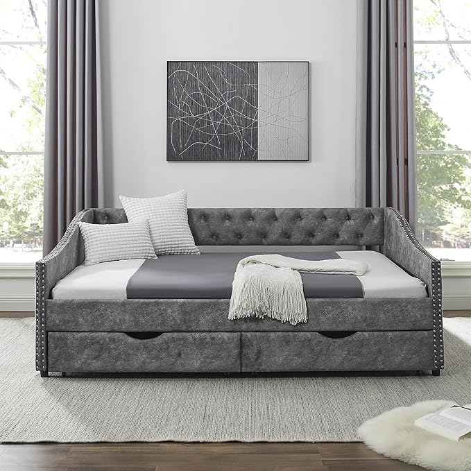 Upholstered Full Size Daybed with Two Storage Trundle Drawers, Solid Wooden Bed Frame w/Button Tufted Backrest, No Box Spring Needed, for Kids, Bedroom, Dorm