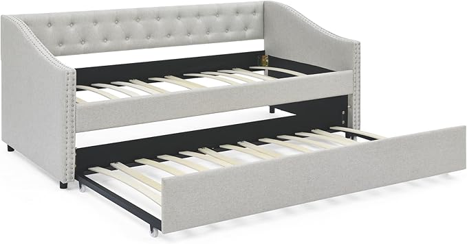 Upholstered Twin Size Daybed with Twin Trundle, Solid Wooden Bed Frame w/Button Tufted Backrest and Copper Nail on Waved Shape Arms, No Spring Box Need, Space-Saving Design