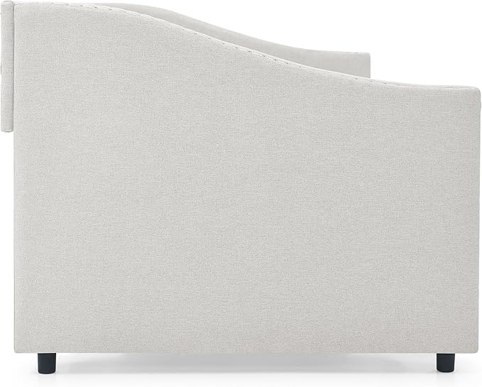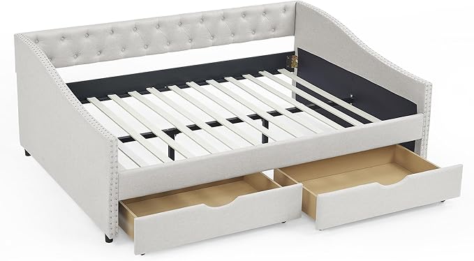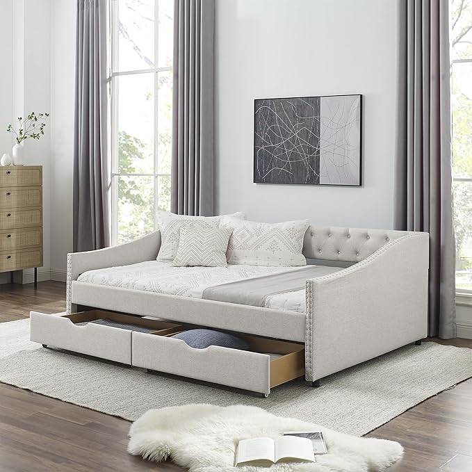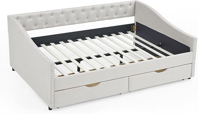 Upholstered Full Size Daybed with Two Storage Trundle Drawers, Solid Wooden Bed Frame w/Button Tufted Backrest, No Box Spring Needed, for Kids, Bedroom, Dorm