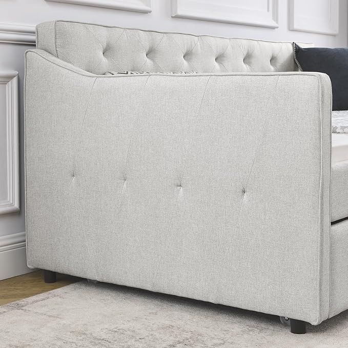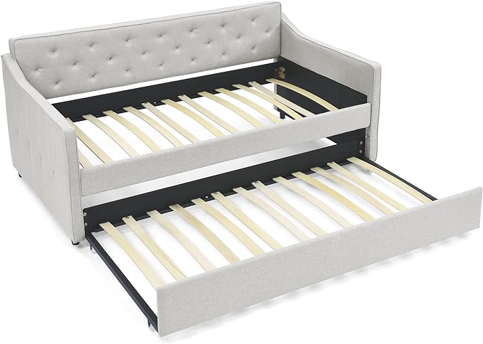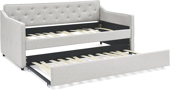 Upholstered Twin Size Daybed with Twin Trundle, Solid Wooden Bed Frame w/Button Tufted Backrest and Waved Shape Arms, No Spring Box Need, for Kids, Bedroom, Dorm
