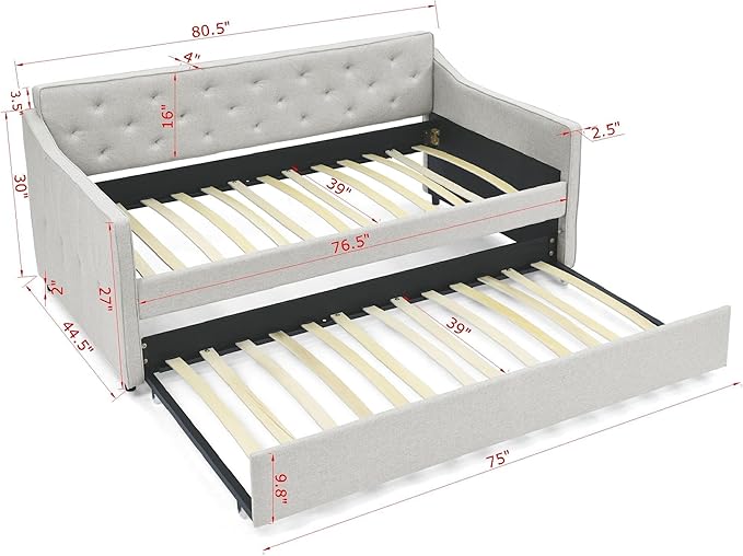 • Pull out Twin Size Trundle: With caster for easy access. Overall size: 80.5“x44.5”x33.5“, Daybed Size: 75x39 inches, Trundle size : 75x39 inches, No Mattress Included, Maximum Weight Capacity:300 lbs.