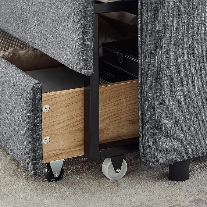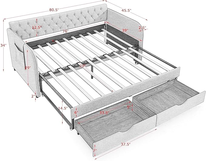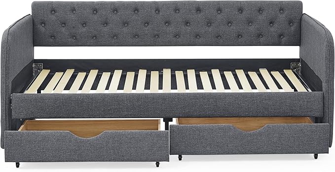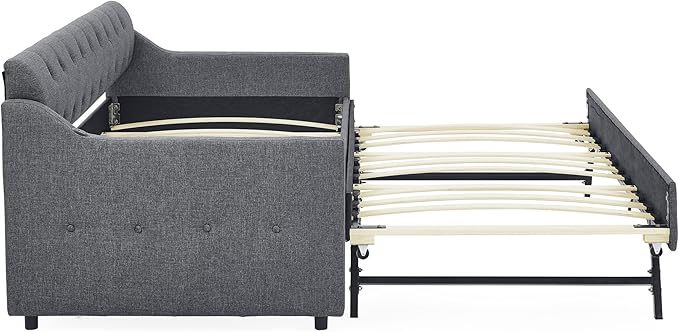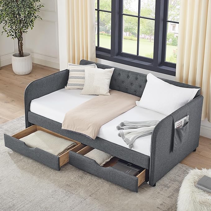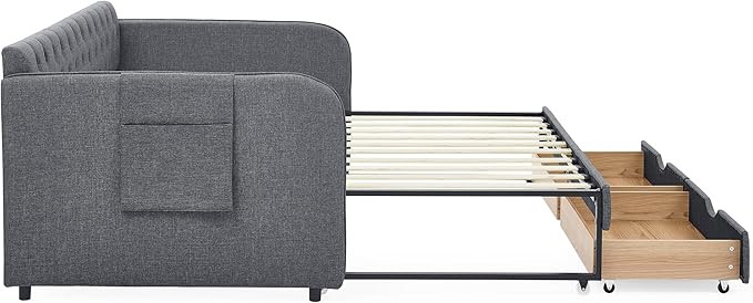 Twin Size Upholstery modern Daybed, Trundle Bed and Two Storage Drawers,pull out Button Tufted Sofa Armrest side with pocket,for Bedroom Living Room,Linen Dark Grey