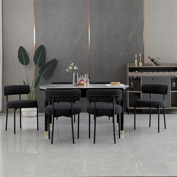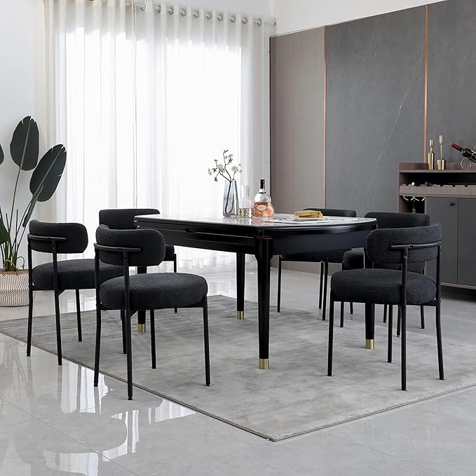 Dining Chairs Set of 6, Boucle Dining Room Chairs Modern Mid-Century Kitchen Chairs Curved Backrest Upholstered Chairs for Dining Room Black Metal Legs, Black