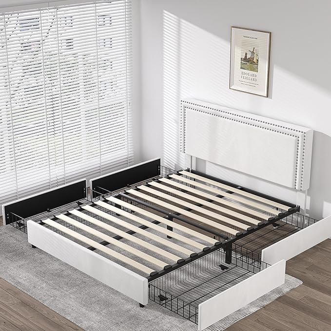 About This Wood & Metal [Bed Frame with 4 Storage Drawers]--The bed frame with 4 storage drawers features easy-to-use wheels...