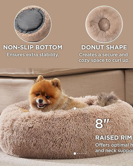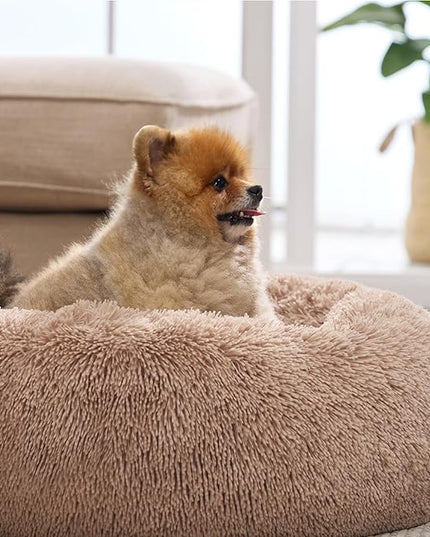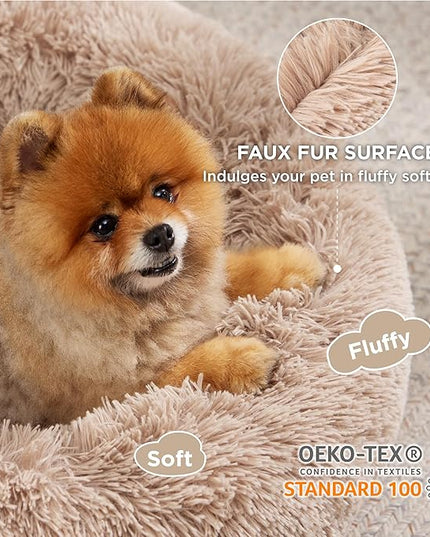 Bedsure Calming Dog Bed for Small Medium Dogs - Donut Washable Medium Pet Bed, 27 inches Anti-Slip Round Fluffy Plush Faux Fur Cat Bed, Camel