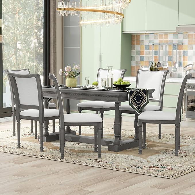 59.4 Inch Dining Table Set for 6, 7-Piece Dining Table with 4 Trestle Base and 6 Upholstered Chairs with Slightly Curve and Ergonomic Seat Back, Grey