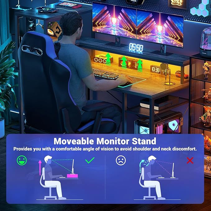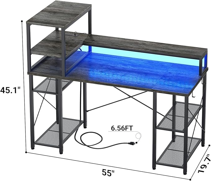 Cyclysio 55 inch Gaming Desk with LED Light, Adjustable Computer Desk with Storage Shelves, Home Office Desk with Power Outlets, Computer Gaming Desk with Long Monitor Stand for Small Space, Grey