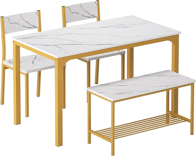 sogesfurniture 4 Piece Dining Table Set, Dining Table Set for 4, Kitchen Dinner Table with Benches for 4, includes Table, 2 Chairs & Bench, White Gold