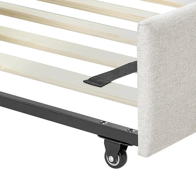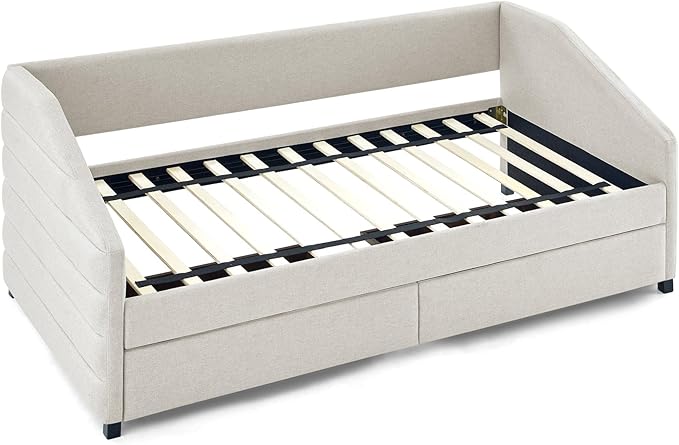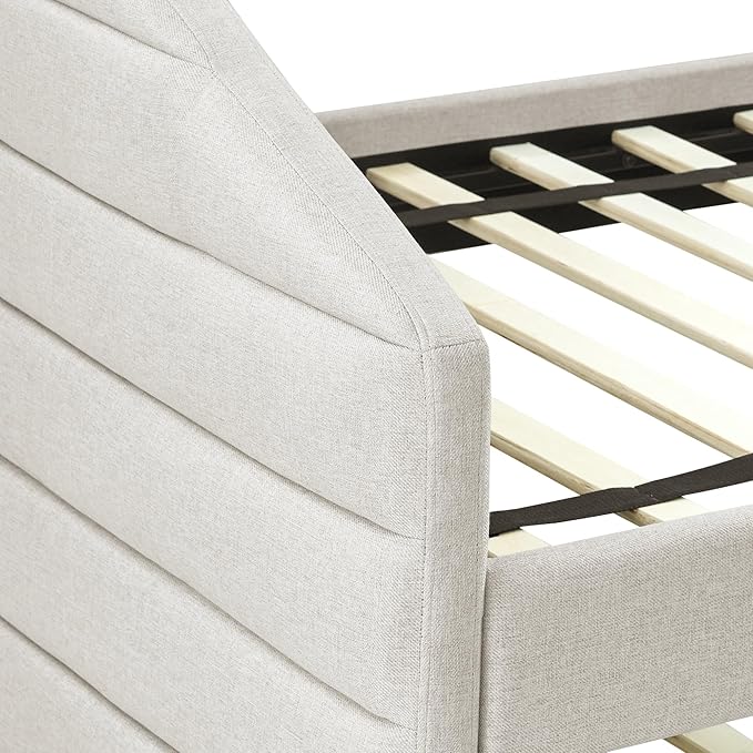 Twin Size Linen Upholstered Daybed with Two Storage Trundle Drawers, Solid Wooden Bed Frame w/Tufted Decorate, No Box Spring Needed, for Kids, Bedroom, Dorm, Beige-5