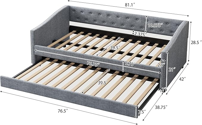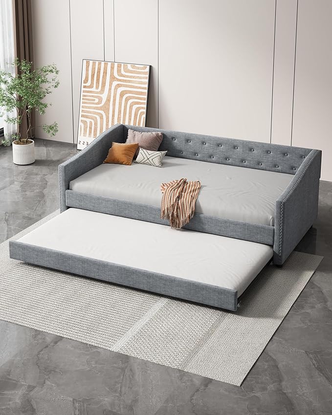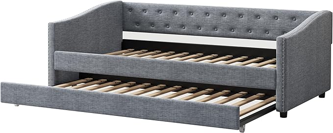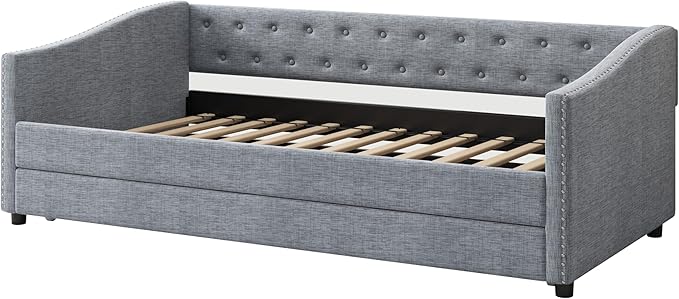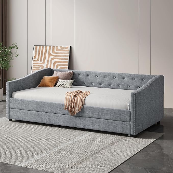 Twin Size Daybed with Trundle, Linen Upholstered Tufted Sofa Day Bed Frame with Button, Waved Shape Arms & Nailhead, Wooden Slats Support for Apartment,Bedroom, Light Grey