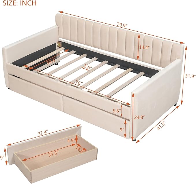 Twin Size Velvet Upholstered Daybed with Two Storage Drawers, Solid Wooden Bed Frame w/Vertical Stripes Designed Backrest and Pine Legs, Space-Saving Design, for Kids, Bedroom, Dorm, Beige-7