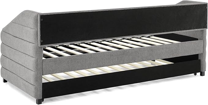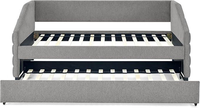 Twin Size Linen Upholstered Daybed with Trundle, Solid Wooden Bedframe w/Pull Out Bed and Tufted Decorate, No Box Spring Needed, for Kids, Bedroom, Dorm, Grey-1