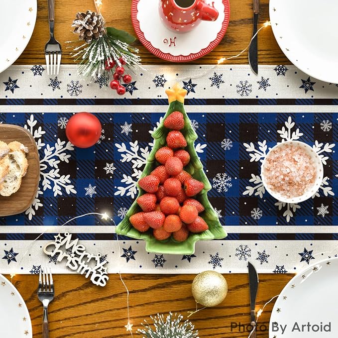 Artoid Mode Buffalo Plaid Snowflakes Blue Christmas Table Runner, Seasonal Winter Kitchen Dining Table Decoration for Home Party Decor 13x108 Inch