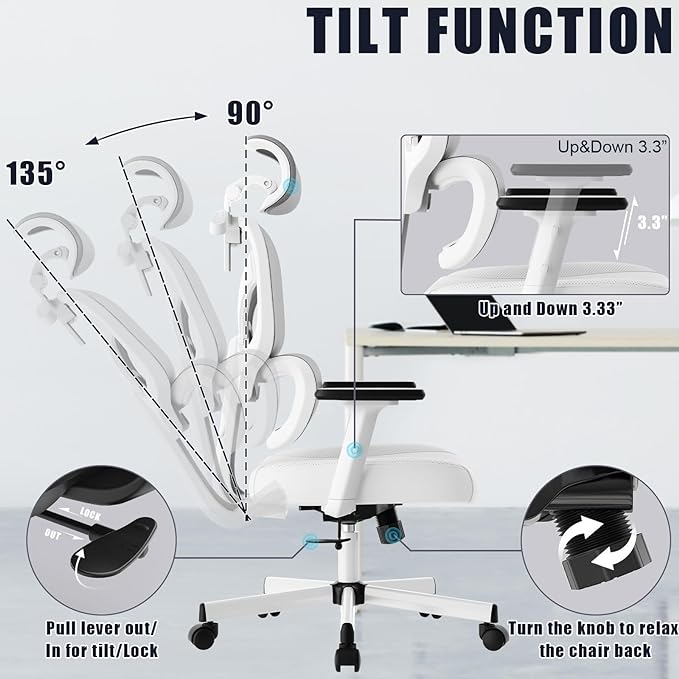 • 【Ergonomic Design】: This ergonomic office chair provides essential support for the head, back, hips,arms and lumbar, promoting spine health and reducing muscle fatigue. Easily adjust the seat height, headrest, backrest, and arms to suit different needs, making it perfect for long hours of office sitting.