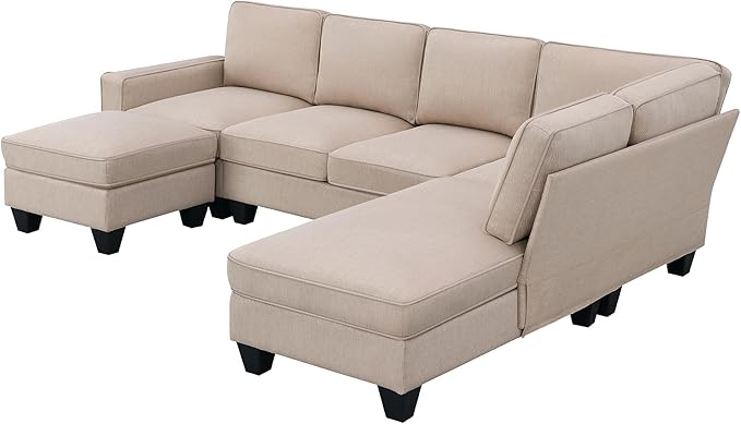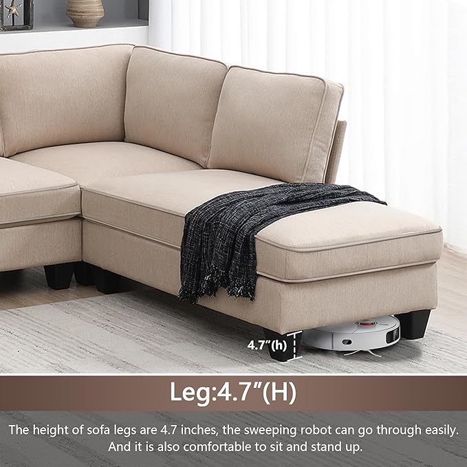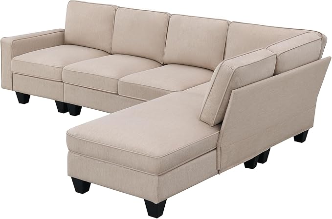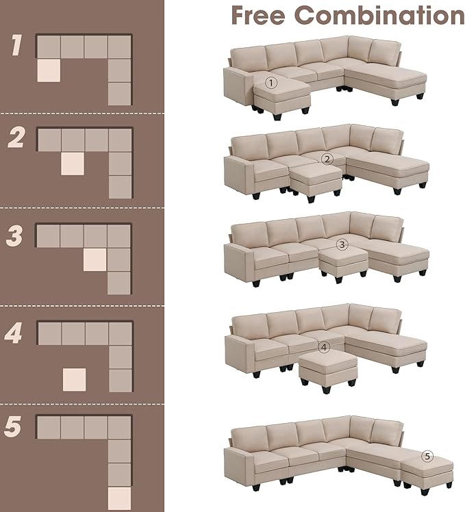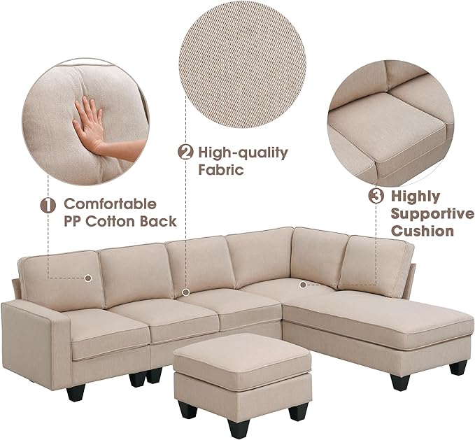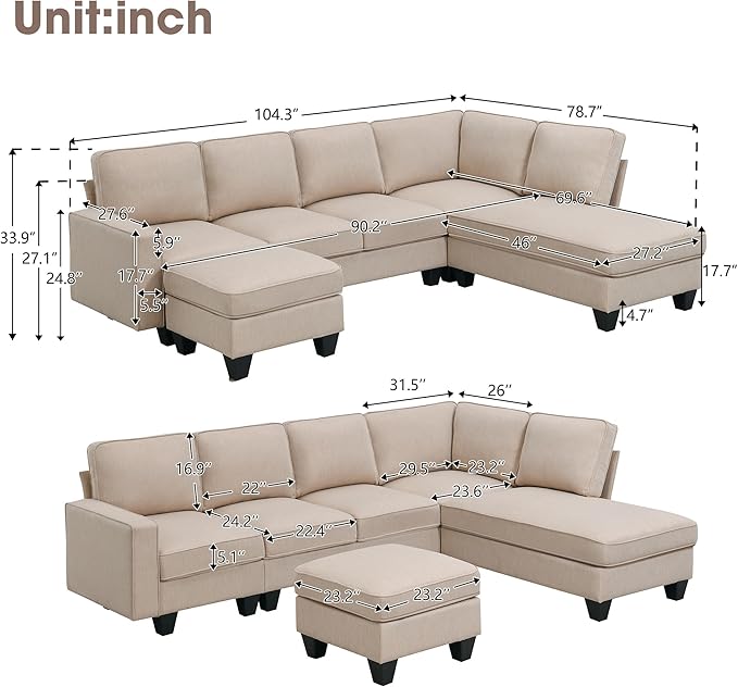 104" L-shaped Sectional Sofa, 7 Seater Couch Set with Chaise Lounge and Convertible Ottoman, Comfy Sectional Sofa for Living Room, Apartment, Office