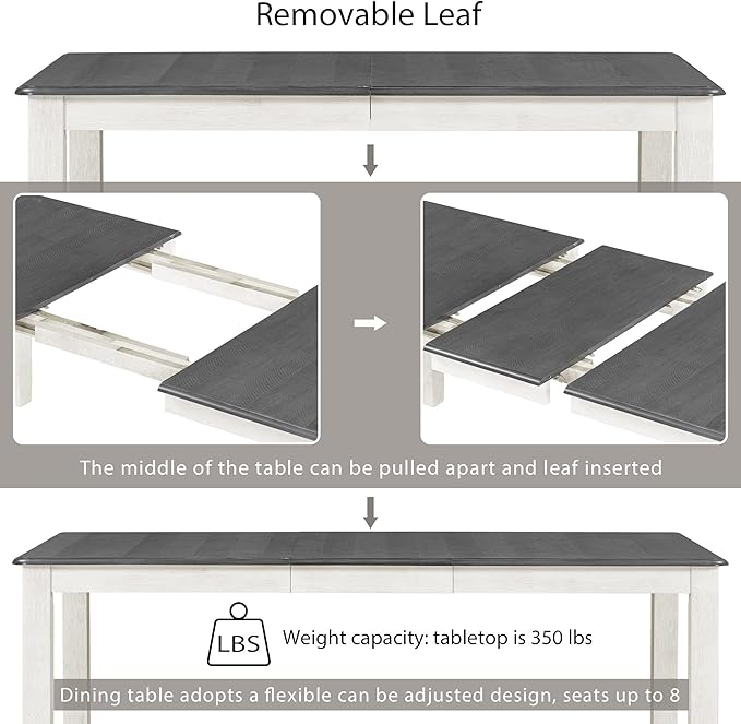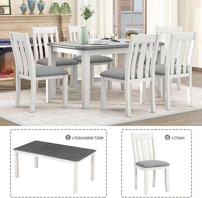 Retro Style 7-Piece Dining Set with Solid Wood Extendable Table and 6 Upholstered Chairs, for Kitchen, Living Room, Home Bar, Easy to Assemble, Gray+White