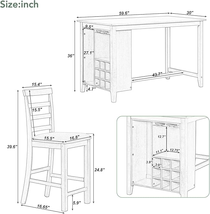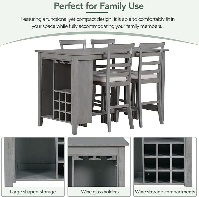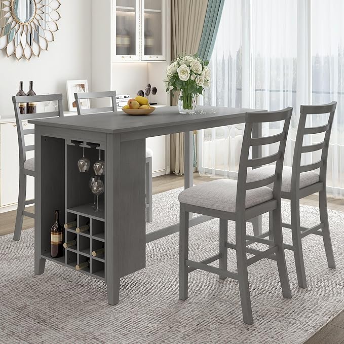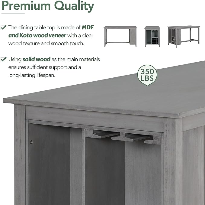 5 Piece Multi-Functional Rubber Wood Counter Height Dining Table Set with Padded Chairs and Integrated 9 Bar Compartment, Wine Glass Holders for Kitchen, Living Room, Grey+Light Gray