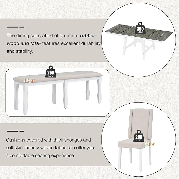 Farmhouse 6-Piece Dining Set, Included Solid Wood Rectangular Extendable Table with Two 12" W Removable Leaves and 4 Upholstered Chairs & a Bench, Home Kitchen Furniture, Brown+White-1