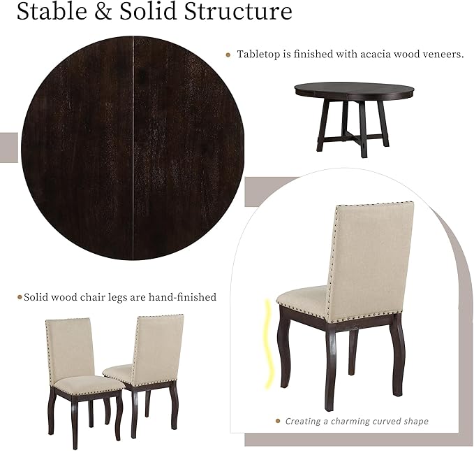 5 Piece Round Farmhouse Wooden Dining Table Set with 4 Upholstered Chairs, Extendable Restaurant Furniture, for Kitchen, Diningroom, Living Room, Espresso+Brown