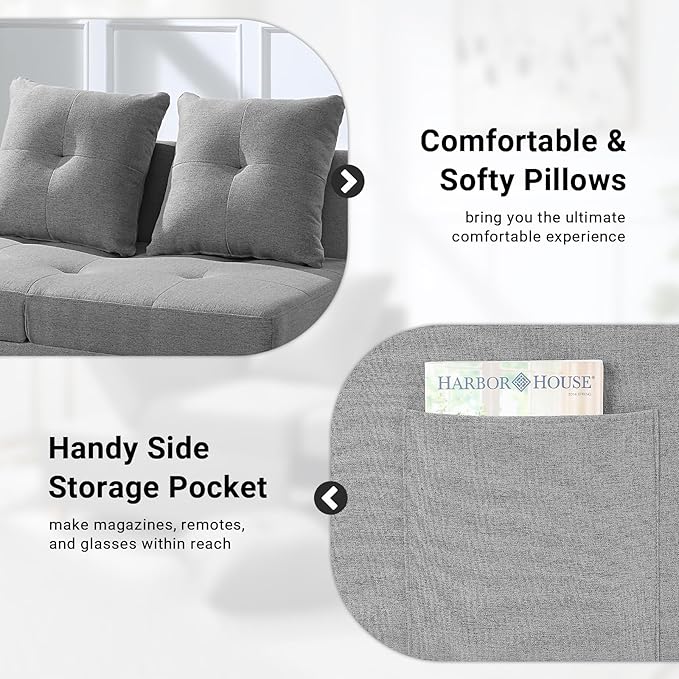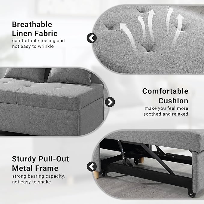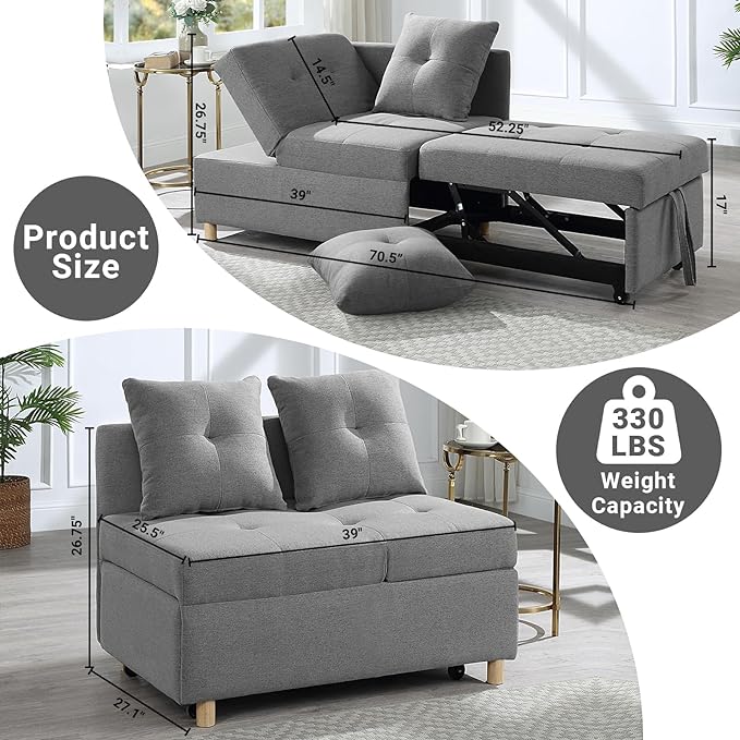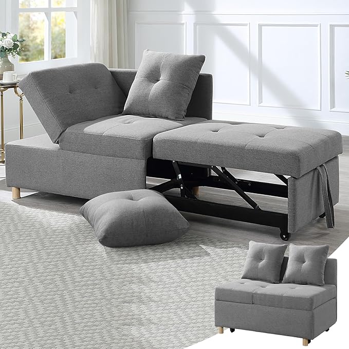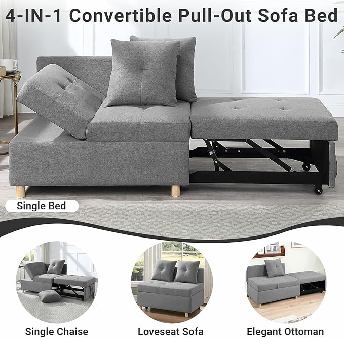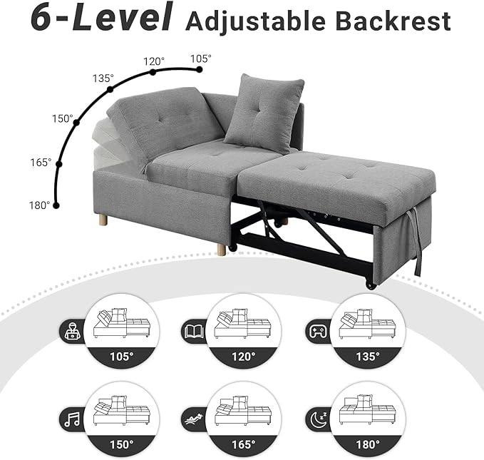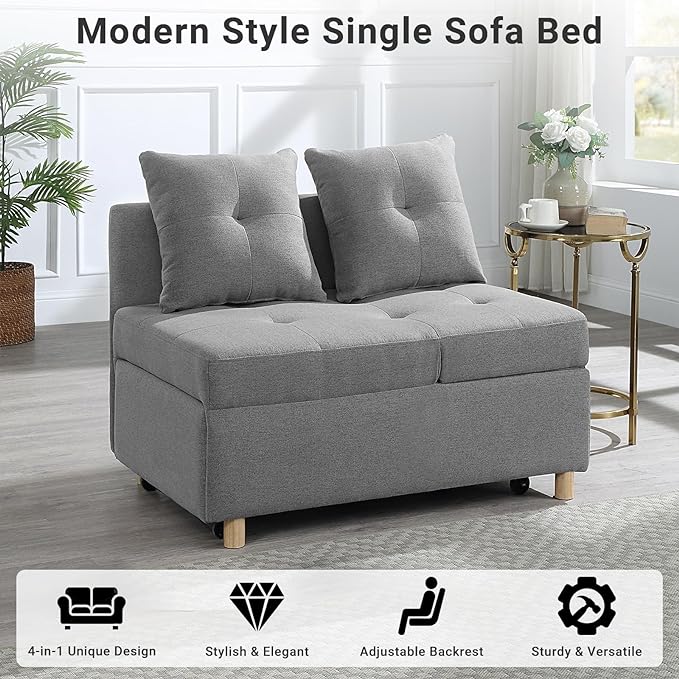 4-in-1 Convertible Sleeper Sofa, Single Pull Out Couch Chair with 6-Level Adjust Backrest Loveseat with Storage and Pillows, Modern Recliner for Living Room Apartment Office, Grey