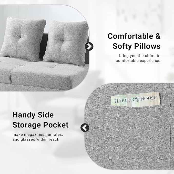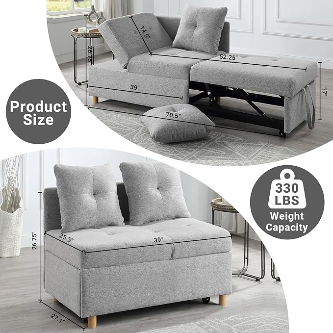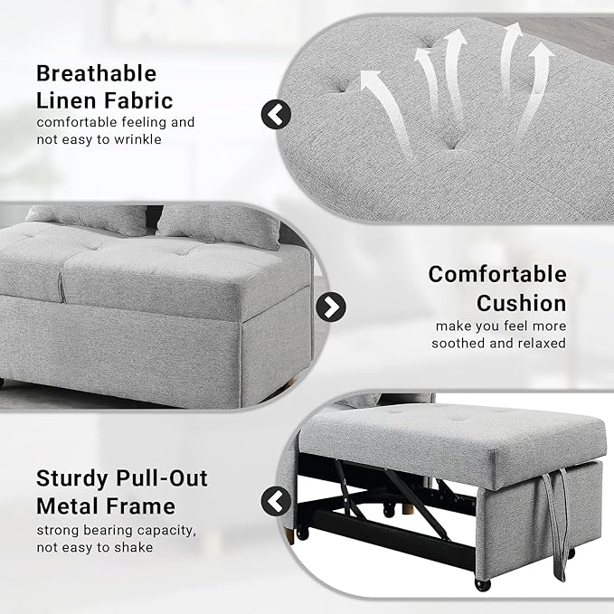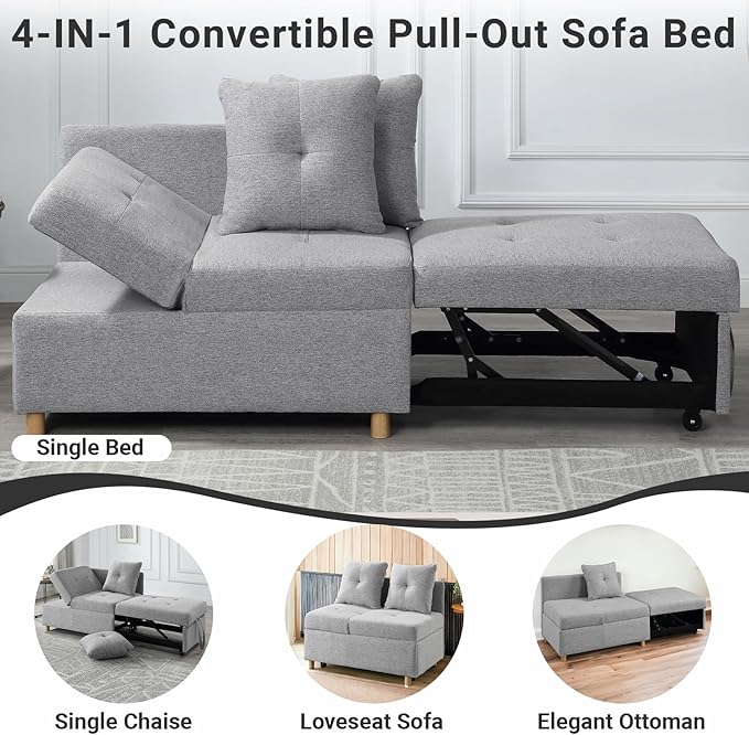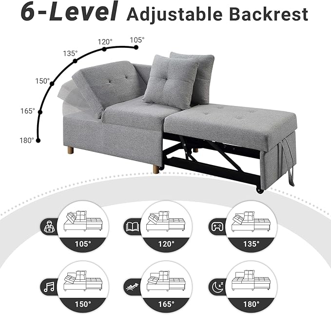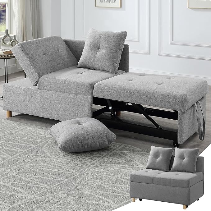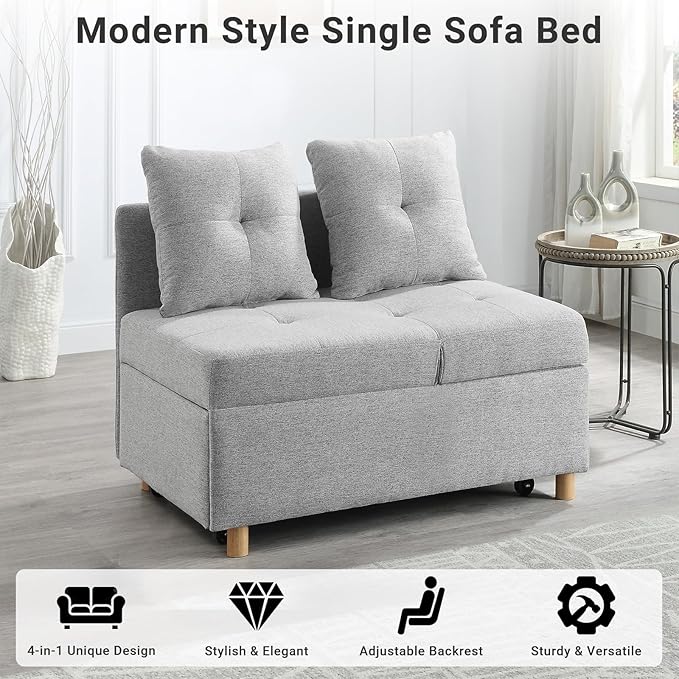 4-in-1 Convertible Sleeper Sofa, Single Pull Out Couch Chair with 6-Level Adjust Backrest Loveseat with Storage and Pillows, Modern Recliner for Living Room Apartment Office, Light Grey