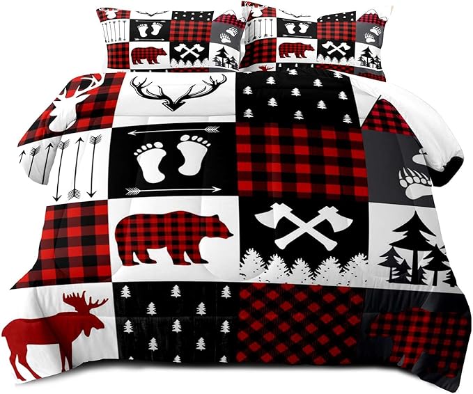 LUVIVIHOME 3PCS Rustic Cabin Comforter Set Queen Size, Christmas Bedding, Deer Bear White Red Black Plaid Patchwork Lodge Log Country Farmhouse Bedroom Decor, Soft Microfiber Quilt, 2 Pillow Shams
