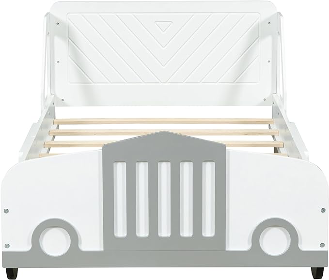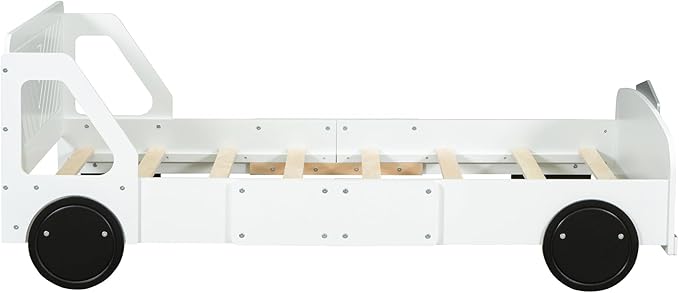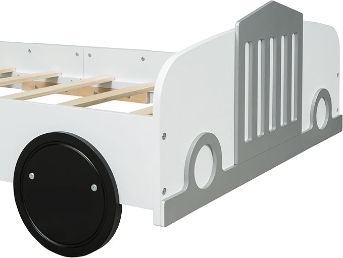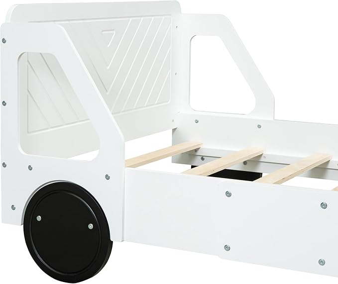 Twin Size Car-Shaped Bed Frame for Kids,Wooden Platform Bed with Wheels and Side Rails for for Boys Girls,Wood Slat Supports,No Box Spring Needed,White