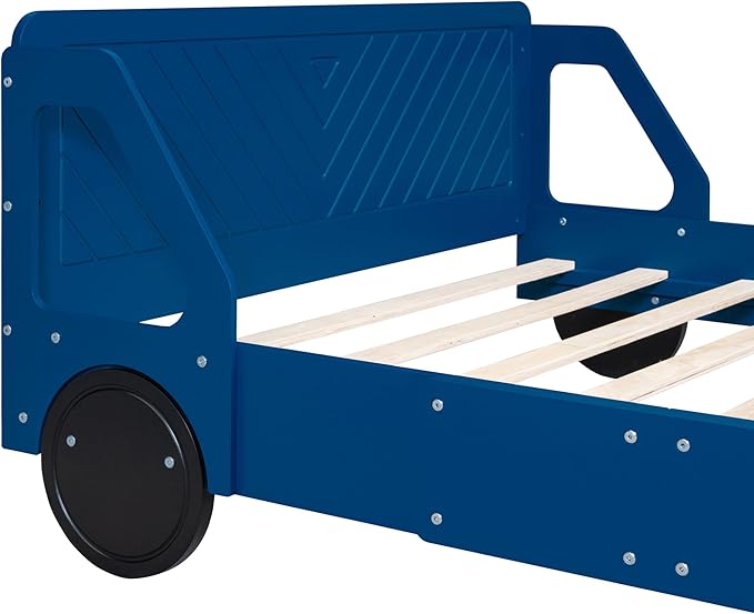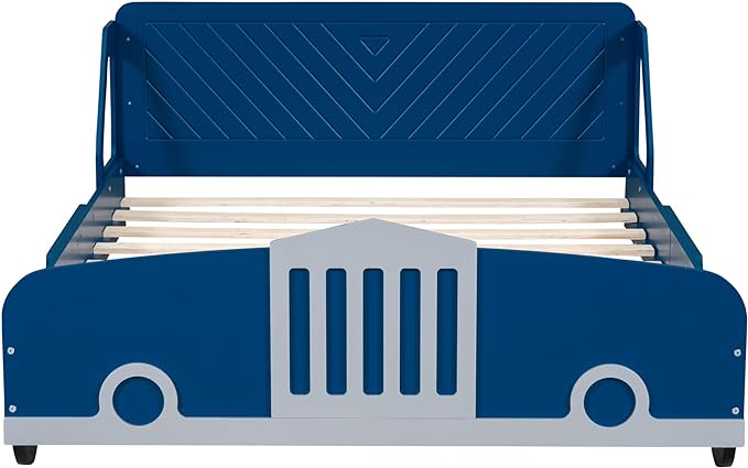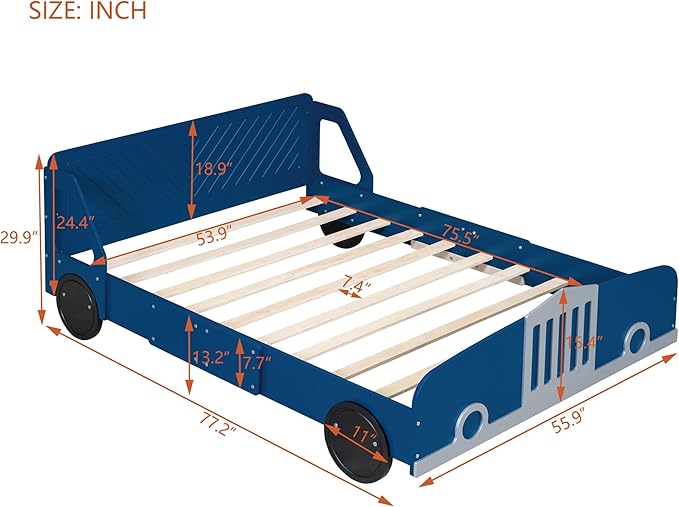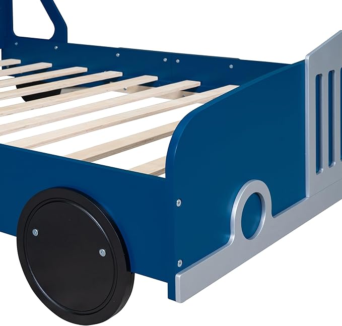 Full Size Car-Shaped Bed Frame for Kids,Wooden Platform Bed with Wheels and Side Rails for for Boys Girls,Wood Slat Supports,No Box Spring Needed,Blue