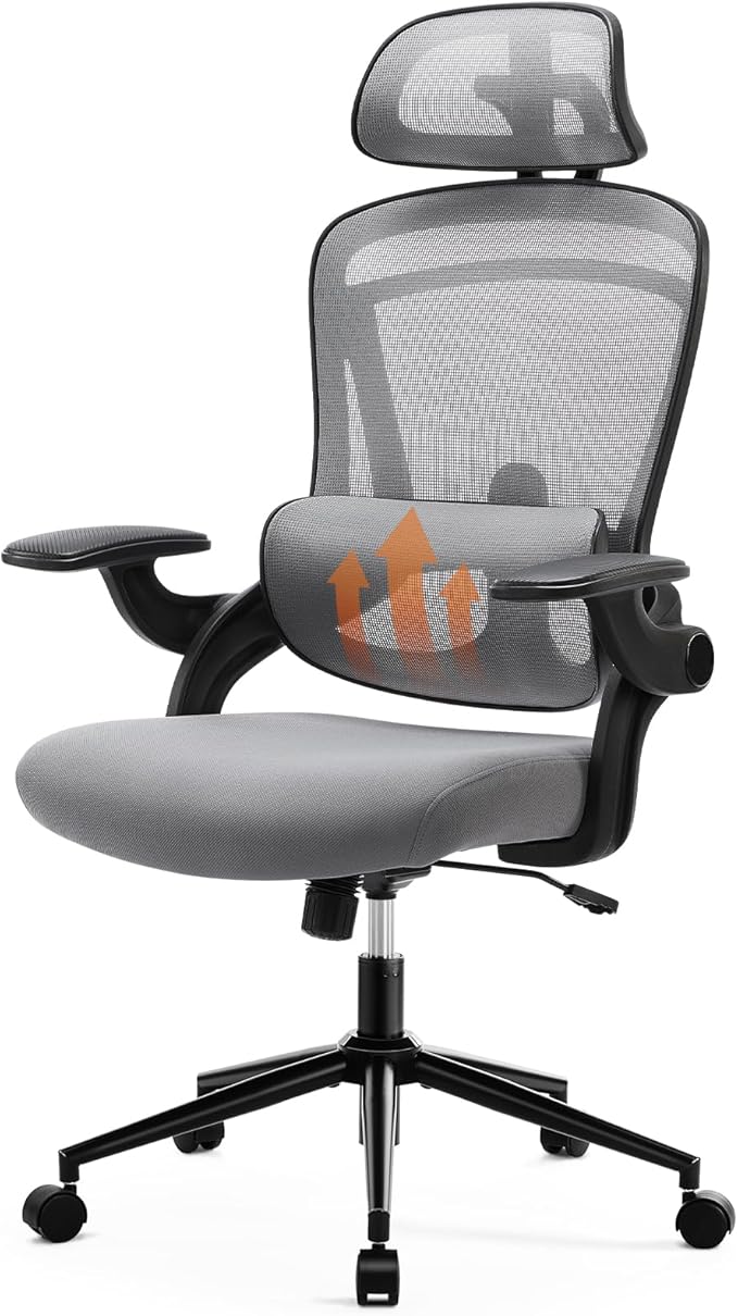 Ergonomic Office Chair, High Back Desk Chair with Adjustable Lumbar Support & Headrest,Comfortable Mesh Computer Chair with Soft Flip Up Arms, Adjustable Height and 120°Tilt,Grey