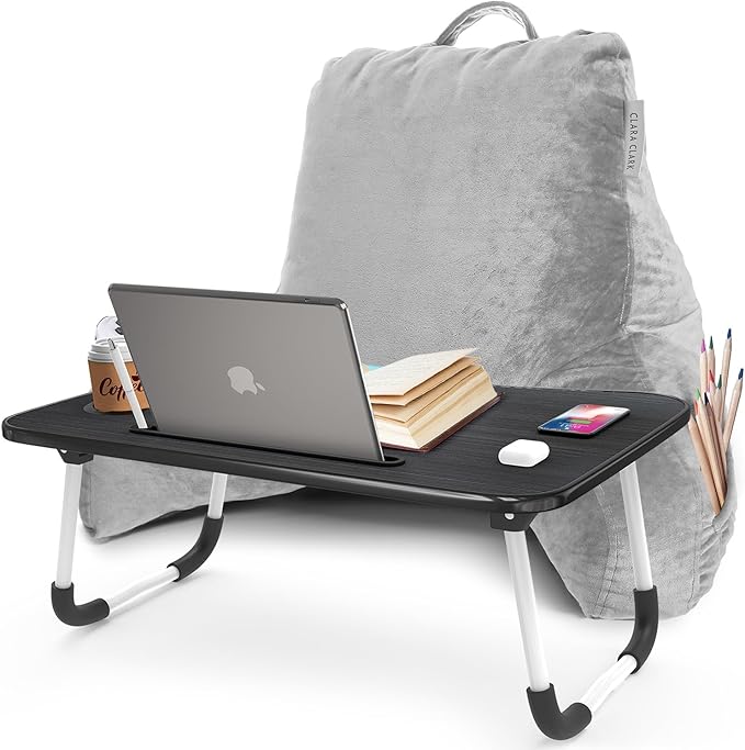 Clara Clark Reading Pillow with Portable Lap Desk for laptop Set, Back Pillow for Sitting Up in Bed, Memory Foam Back Support Pillow, Bed Rest Pillow with Foldable Laptop Desk, Standard - Light Grey