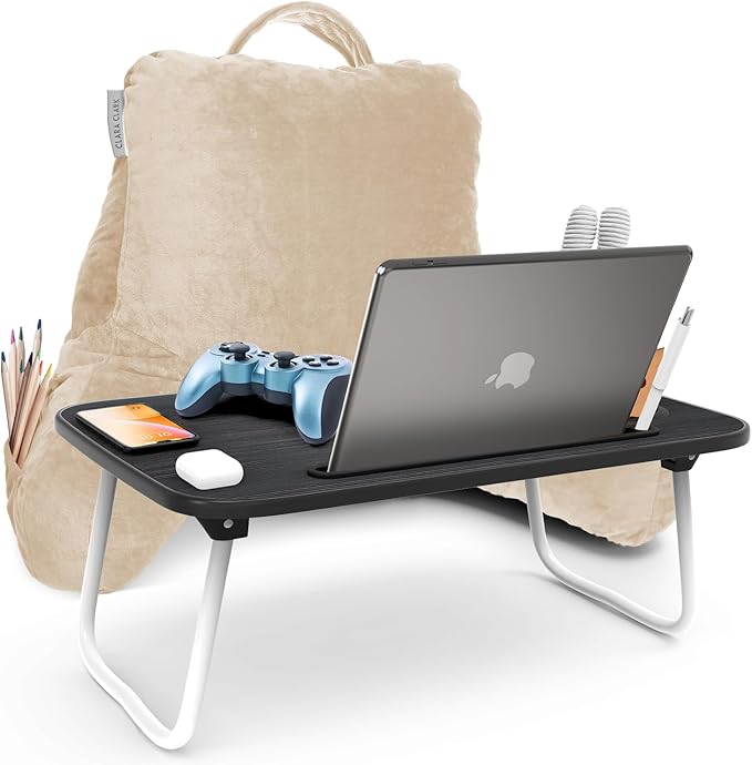 Clara Clark Reading Pillow with Portable Lap Desk Set for Kids, Back Pillow for Sitting Up in Bed, Memory Foam Back Support Pillow, Bed Rest Pillow with Foldable Laptop Desk, Small - Beige Cream