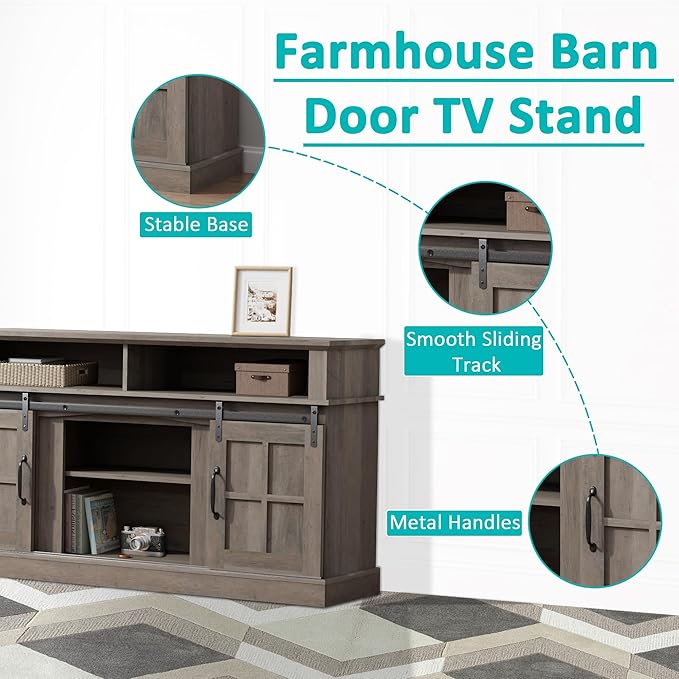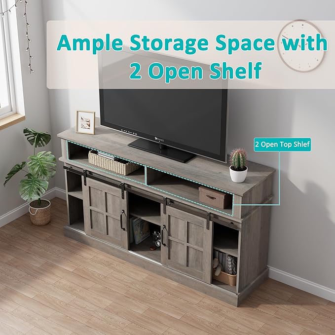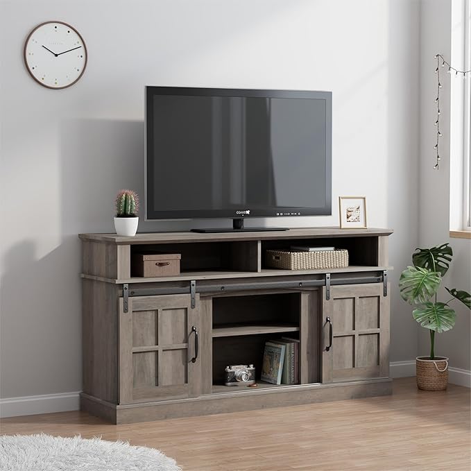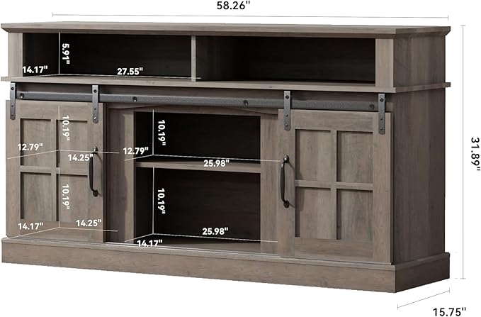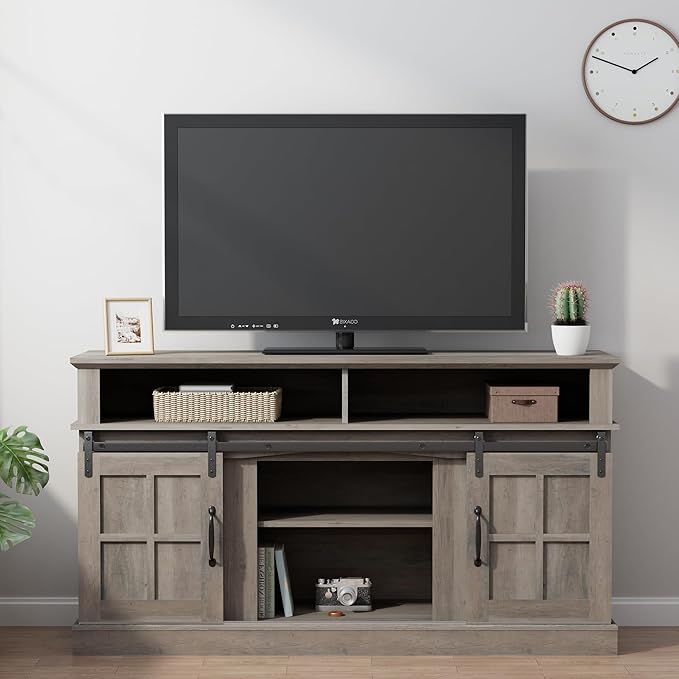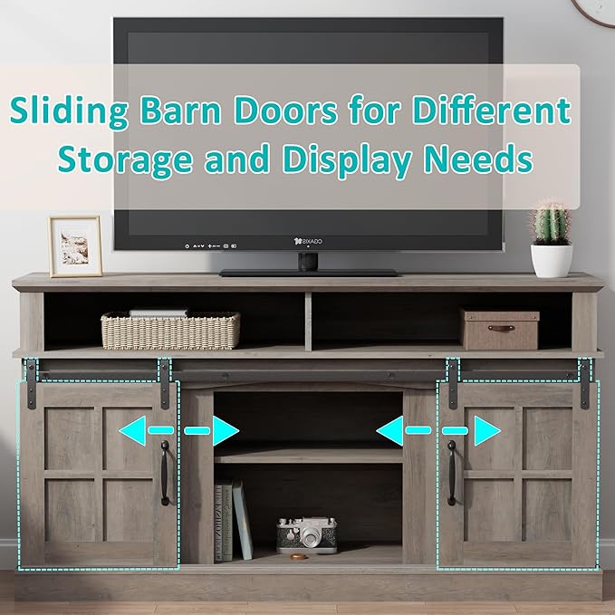 TV Stand with 2 Sliding Barn Doors, 58 Inch TV Stand with Storage Cabinet and Shelves, Television Stands with Storage for Living Room, Bedroom, Brown