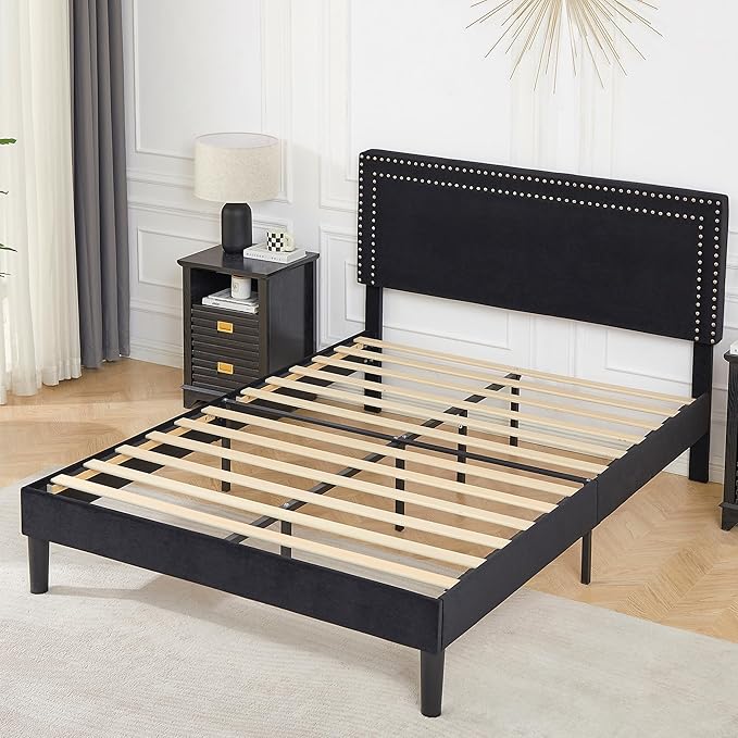 • [NO BOX SPRING NEEDED] - Metal frame and 12 wood slats support platform to extend the life of your mattress, This upholstered bed frame suitable for all kinds of mattresses, spring, memory foam, latex, or hybrid mattress.Max Weight capacity: 700 lbs