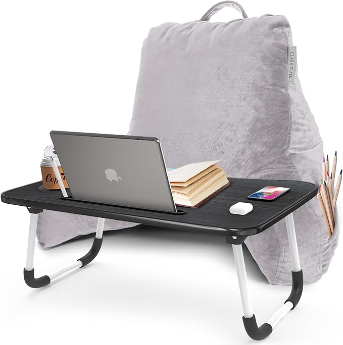 Clara Clark Reading Pillow with Portable Lap Desk for laptop Set, Back Pillow for Sitting Up in Bed, Memory Foam Back Support Pillow Bed Rest Pillow with Foldable Laptop Desk, Standard - Grey Lavender