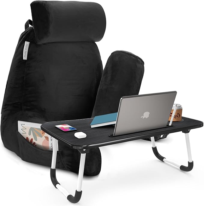 Clara Clark Reading Pillow with Portable Lap Desk for laptop Set, Back Pillow for Sitting Up in Bed, Memory Foam Back Support Pillow, Bed Rest Pillow with Foldable Laptop Desk, Large - Black