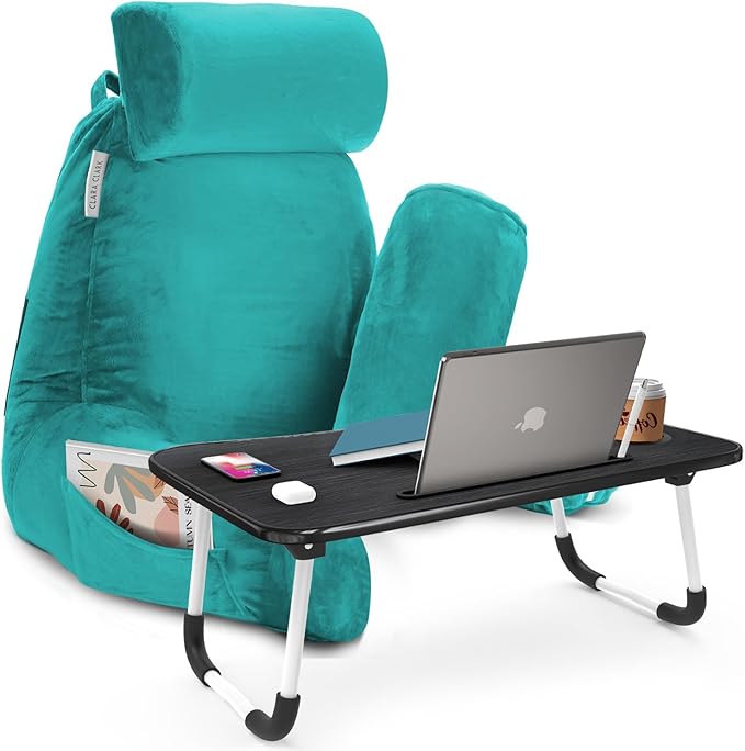 Clara Clark Reading Pillow with Portable Lap Desk for laptop Set, Back Pillow for Sitting Up in Bed, Memory Foam Back Support Pillow, Bed Rest Pillow with Foldable Laptop Desk, Large - Teal