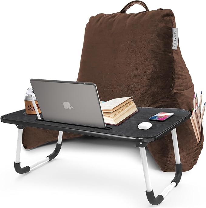 Clara Clark Reading Pillow with Portable Lap Desk for laptop Set, Back Pillow for Sitting Up in Bed Memory Foam Back Support Pillow Bed Rest Pillow with Foldable Laptop Desk, Standard, Chocolate Brown