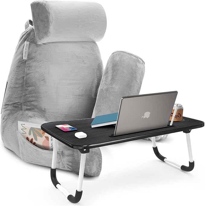 Clara Clark Reading Pillow with Portable Lap Desk for laptop Set, Back Pillow for Sitting Up in Bed, Memory Foam Back Support Pillow, Bed Rest Pillow with Foldable Laptop Desk, Large - Light Grey