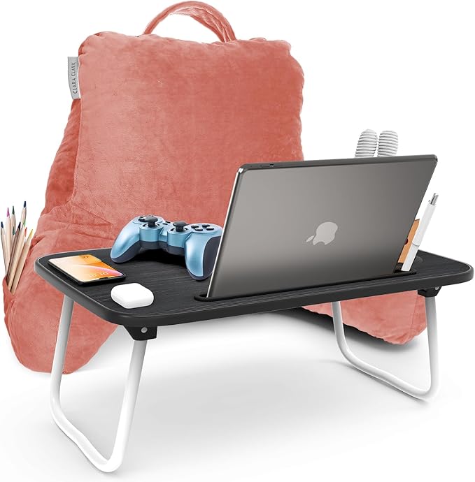 Clara Clark Reading Pillow with Portable Lap Desk Set for Kids, Back Pillow for Sitting Up in Bed, Memory Foam Back Support Pillow, Bed Rest Pillow with Foldable Laptop Desk, Small - Misty Rose