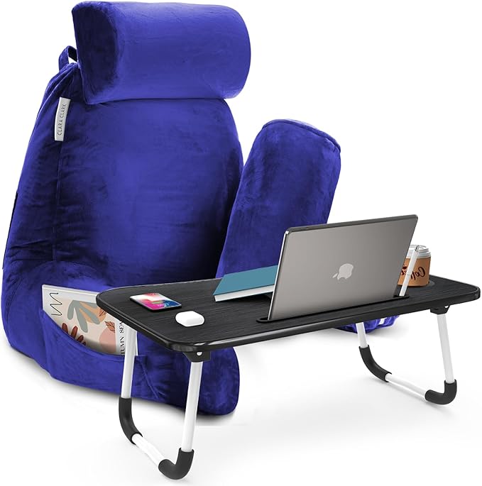 Clara Clark Reading Pillow with Portable Lap Desk for laptop Set, Back Pillow for Sitting Up in Bed, Memory Foam Back Support Pillow, Bed Rest Pillow with Foldable Laptop Desk, Large - Royal Blue