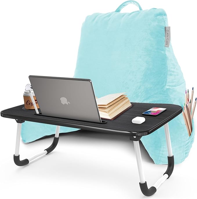 Clara Clark Reading Pillow with Portable Lap Desk for laptop Set, Back Pillow for Sitting Up in Bed, Memory Foam Back Support Pillow, Bed Rest Pillow with Foldable Laptop Desk, Standard - Light Blue