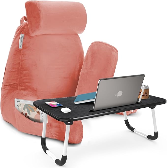 Clara Clark Reading Pillow with Portable Lap Desk for laptop Set, Back Pillow for Sitting Up in Bed, Memory Foam Back Support Pillow, Bed Rest Pillow with Foldable Laptop Desk, Large - Misty Rose