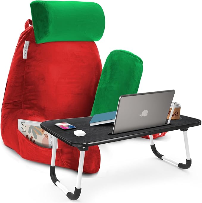 Clara Clark Reading Pillow with Portable Lap Desk for laptop Set, Back Pillow for Sitting Up in Bed, Memory Foam Back Support Pillow, Bed Rest Pillow with Foldable Laptop Desk, Large - Holiday Color