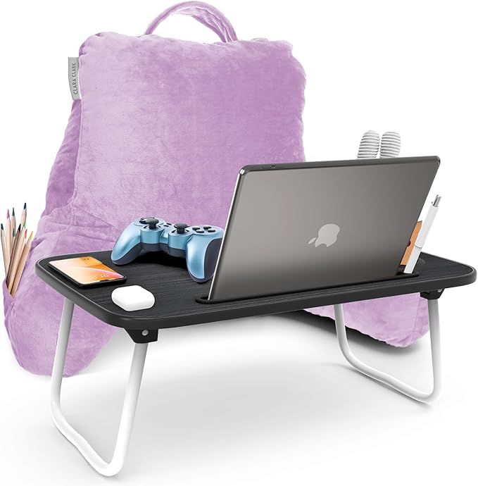 Clara Clark Reading Pillow with Portable Lap Desk Set for Kids, Back Pillow for Sitting Up in Bed, Memory Foam Back Support Pillow, Bed Rest Pillow with Foldable Laptop Desk, Small - Lavender